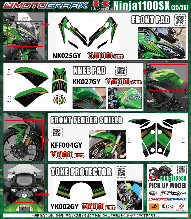 MOTOGRAFIX社よりKAWASAKI Ninja1100SX(25/26)専用 MOTOGRAFIX FRONT PAD、KNEE PAD、FRONT FENDER SHIELD、YOKE PROTECTOR 好評発売中!