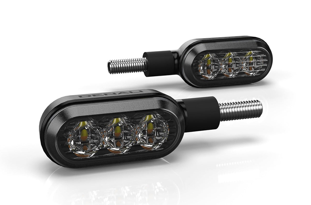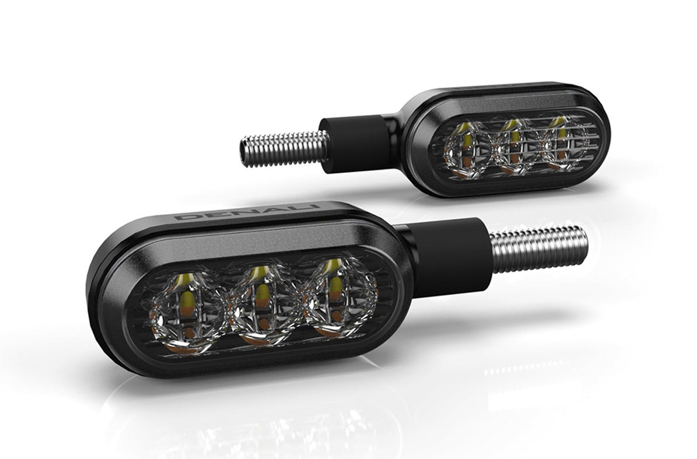 フロントT3ウィンカーは、超高輝度の白色ランニングライトを備え、ウィンカーを作動させるとアンバー色に切り替わります。
