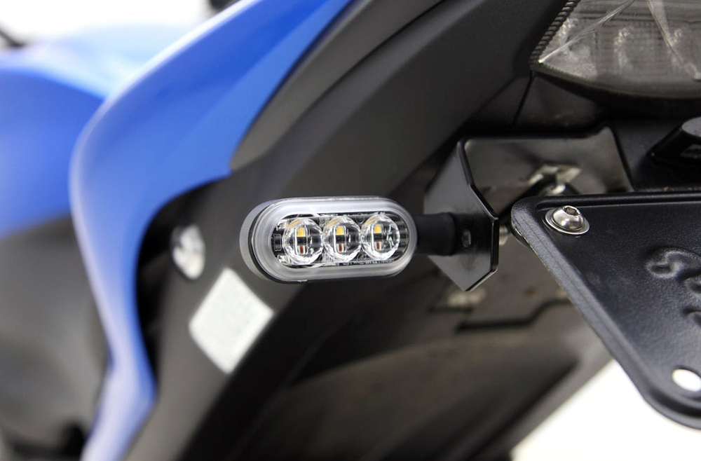 T3シグナルポッドのM8スタッドバージョンは、純正ウィンカーの交換用として設計されており、T3のサイズは薄型でコンパクトながらも高出力LEDによりアンバーシグナルライトは純正よりもはるかに明るく発光します。リア用のみ搭載されている赤色ブレーキライト回路により、他の補助ブレーキライトを追加することなく最大限の視認性を確保します。