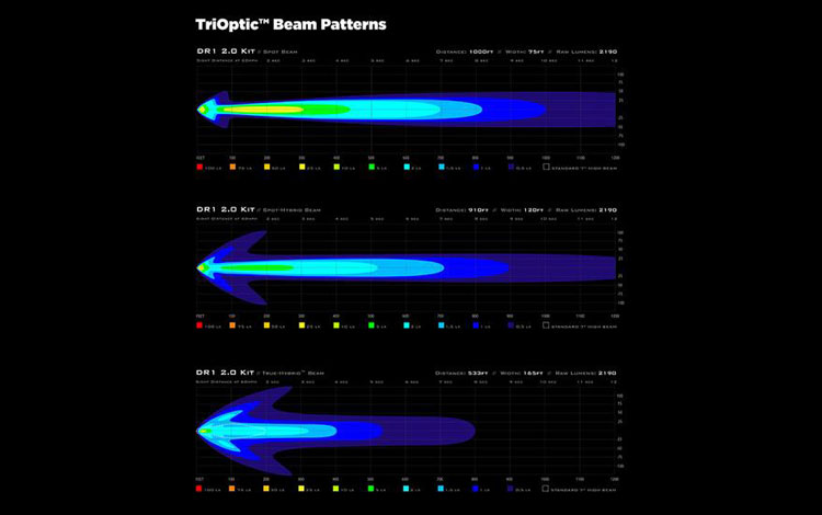 DR1 TriOptic Lens Kitは、霧や雨の状況での視認性を最大に引き出せるように設計されています。AmberとYellowの2色のレンズカラーはどちらも、水蒸気を反射して視認性を低下させる青色の周波数を光から遮断することで、霧や雨の中での視認性を高めます。このキットには、2つのスポットレンズと、2つのTrue-HybridTMレンズが含まれています。距離を最大にする場合には、2つのスポットレンズを使用し、50/50 True-HybridTMの場合には、2つのTrue-HybridTM レンズを使用するか、それぞれの1つずつを使用して、距離を維持しながら近距離フィルを追加するスポット、True-HybridTMをご使用いただけます。