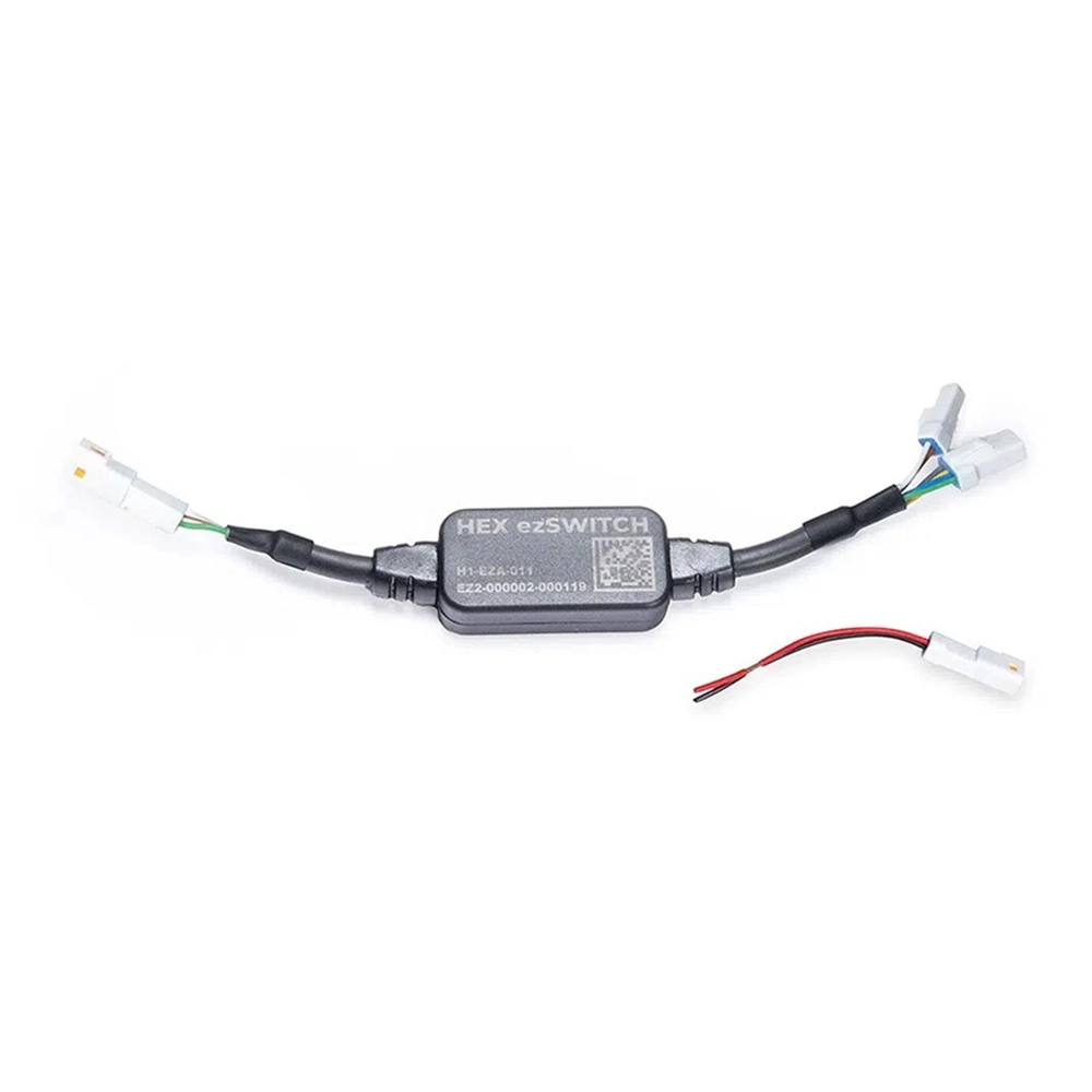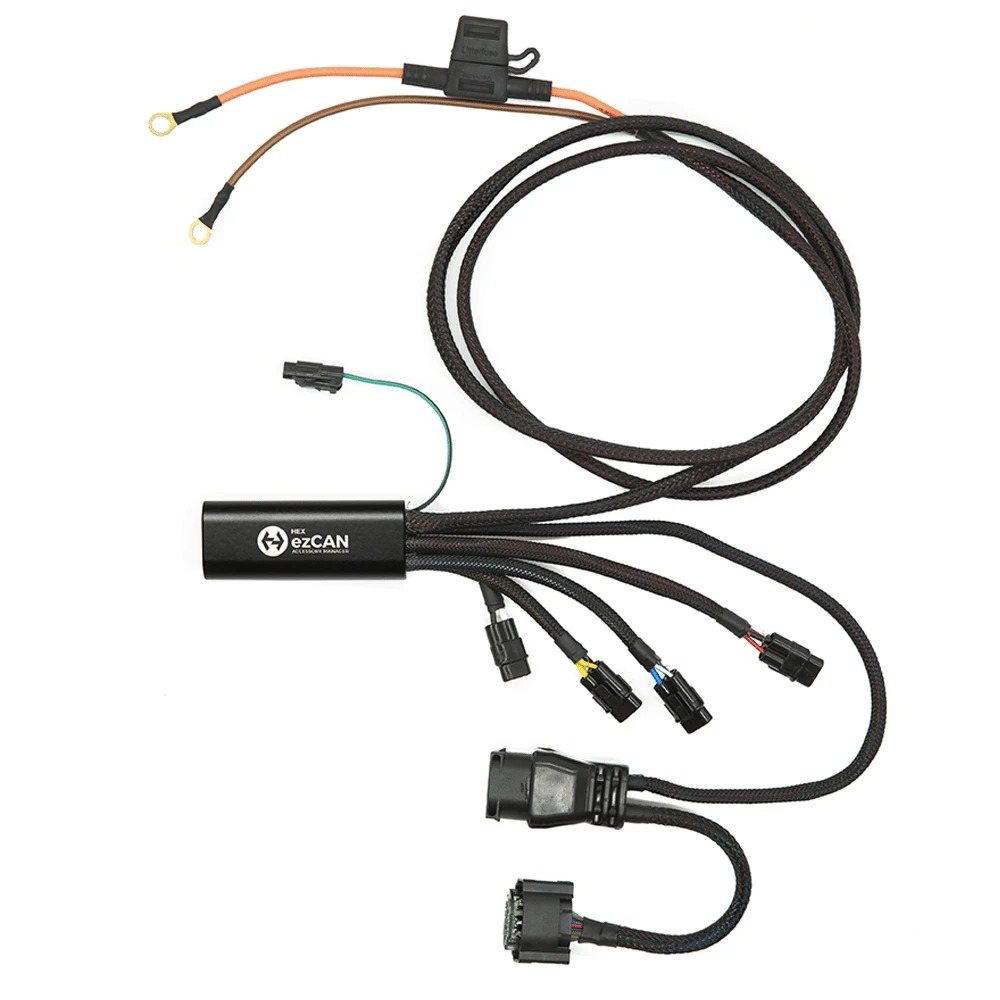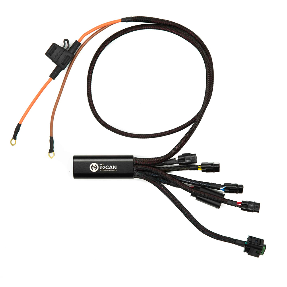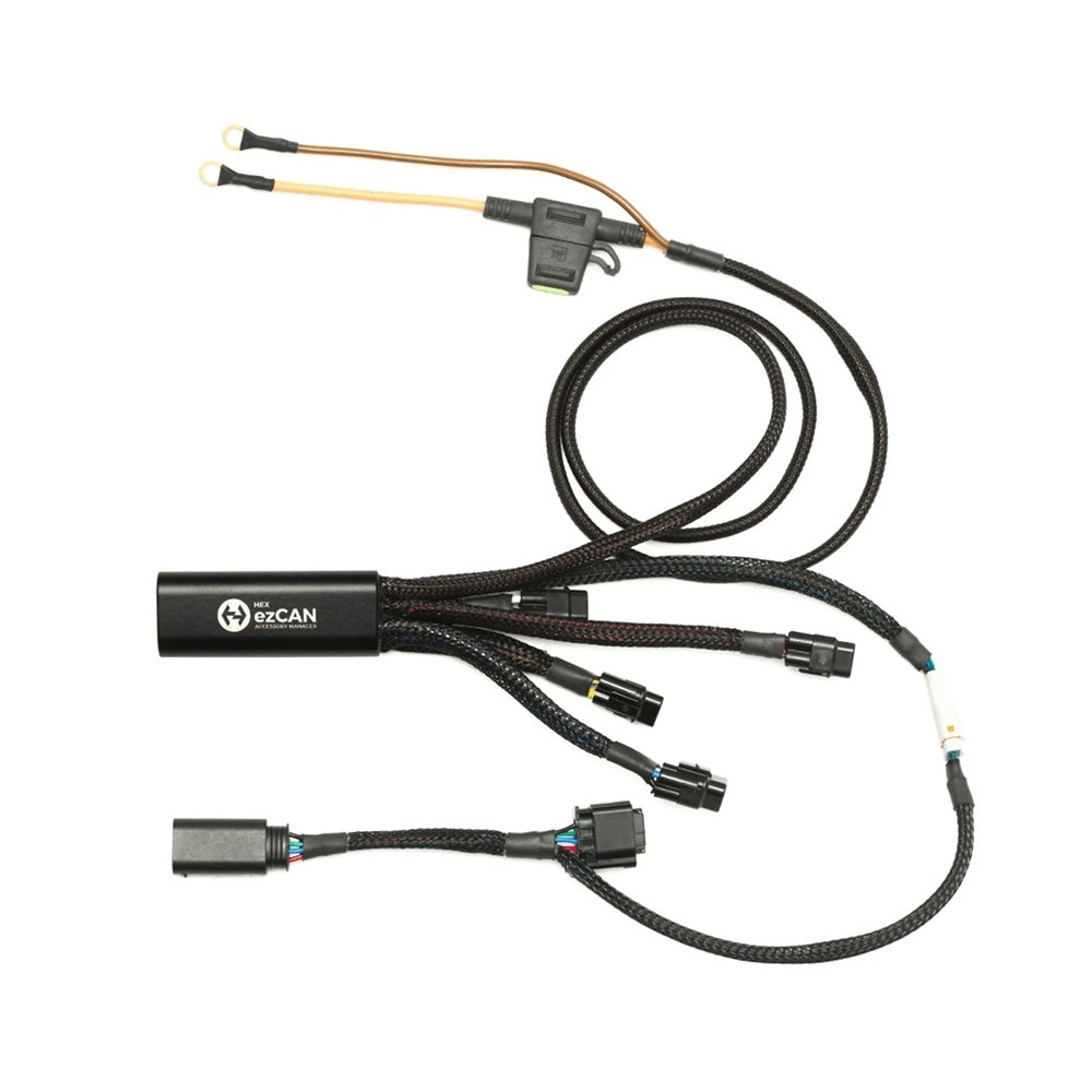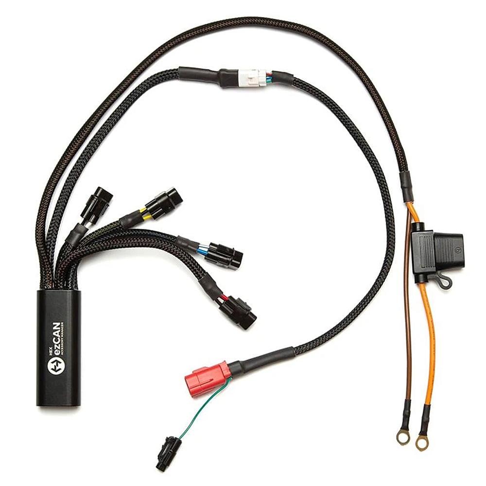 HEX ezCAN 拡張キットには、フロント補助ライト、ブレーキ ライト、ホーンを ezCAN に接続するために必要なものがすべて揃っており、その他のアクセサリーを容易に接続できるようにするための追加コネクタも付いています。