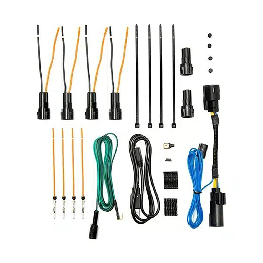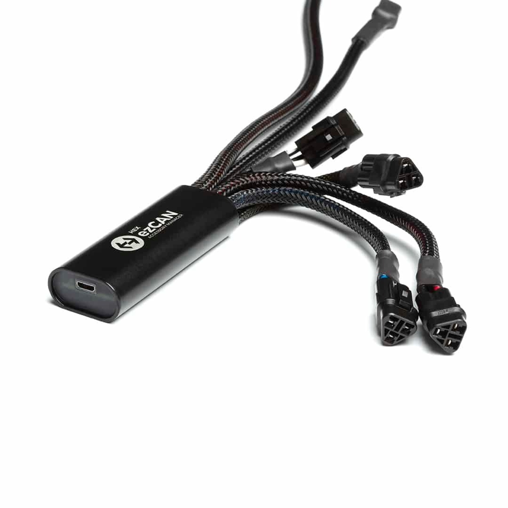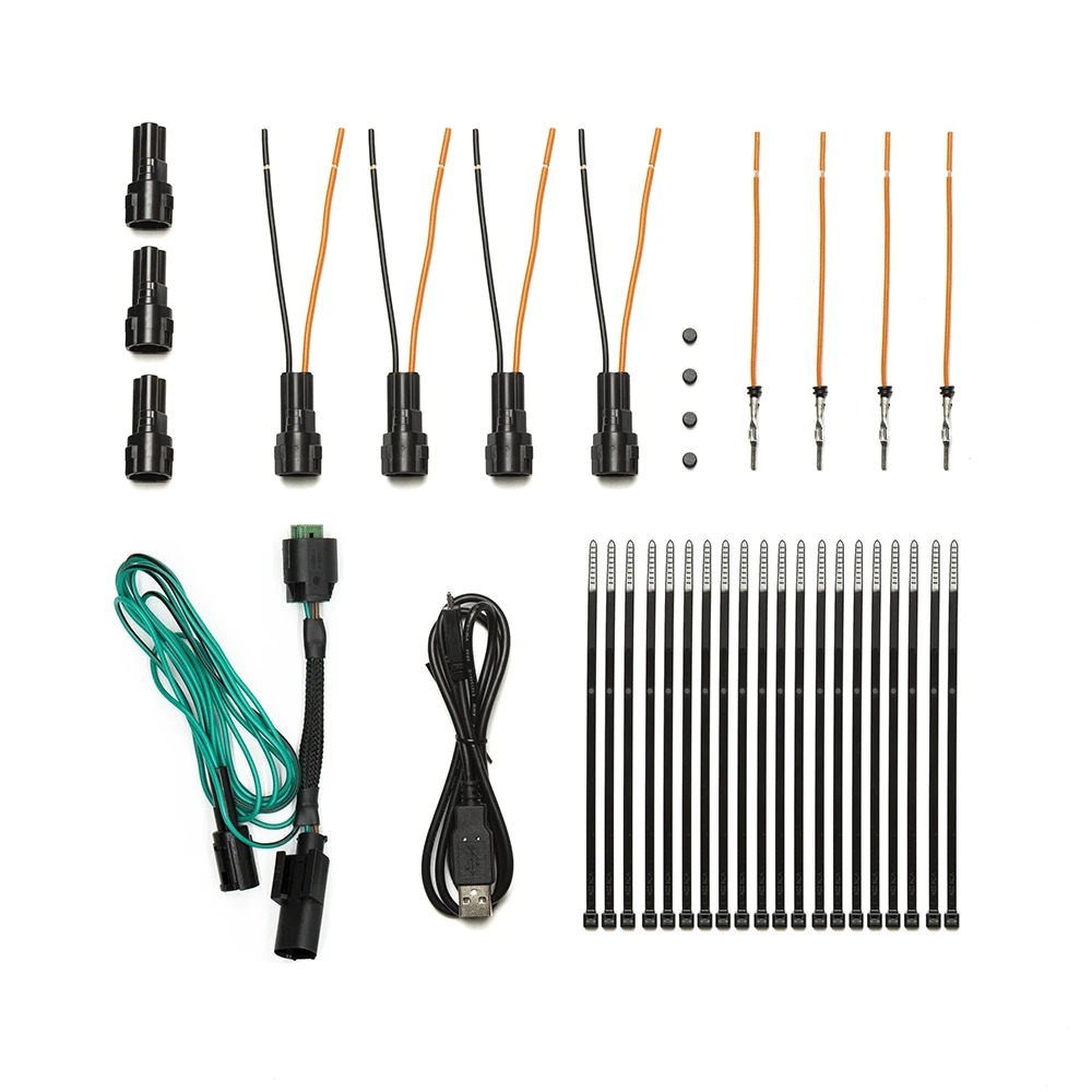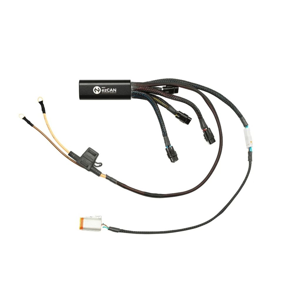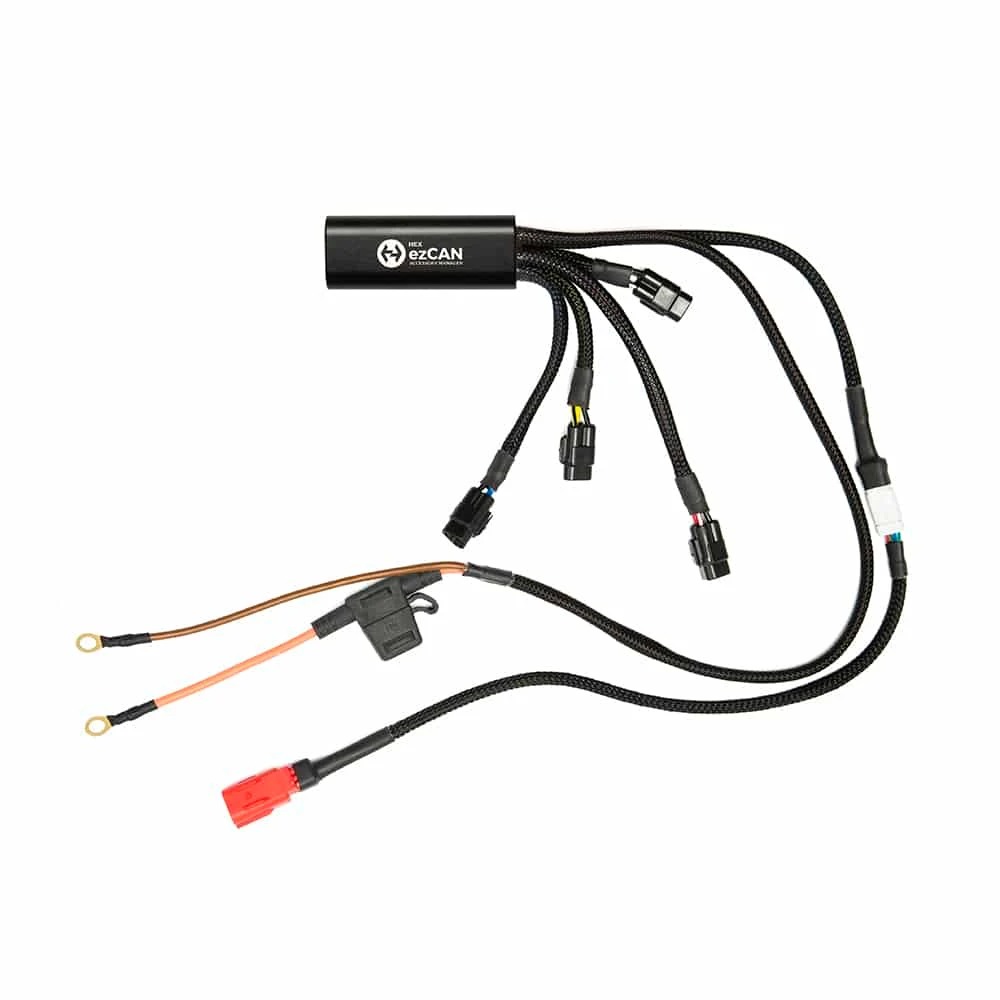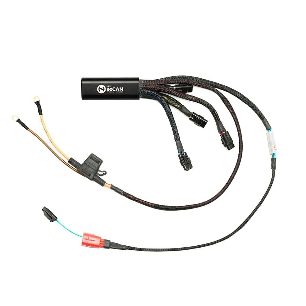 HEX ezCAN 拡張キットには、フロント補助ライト、ブレーキ ライト、ホーンを ezCAN に接続するために必要なものがすべて揃っており、その他のアクセサリーを容易に接続できるようにするための追加コネクタも付いています。