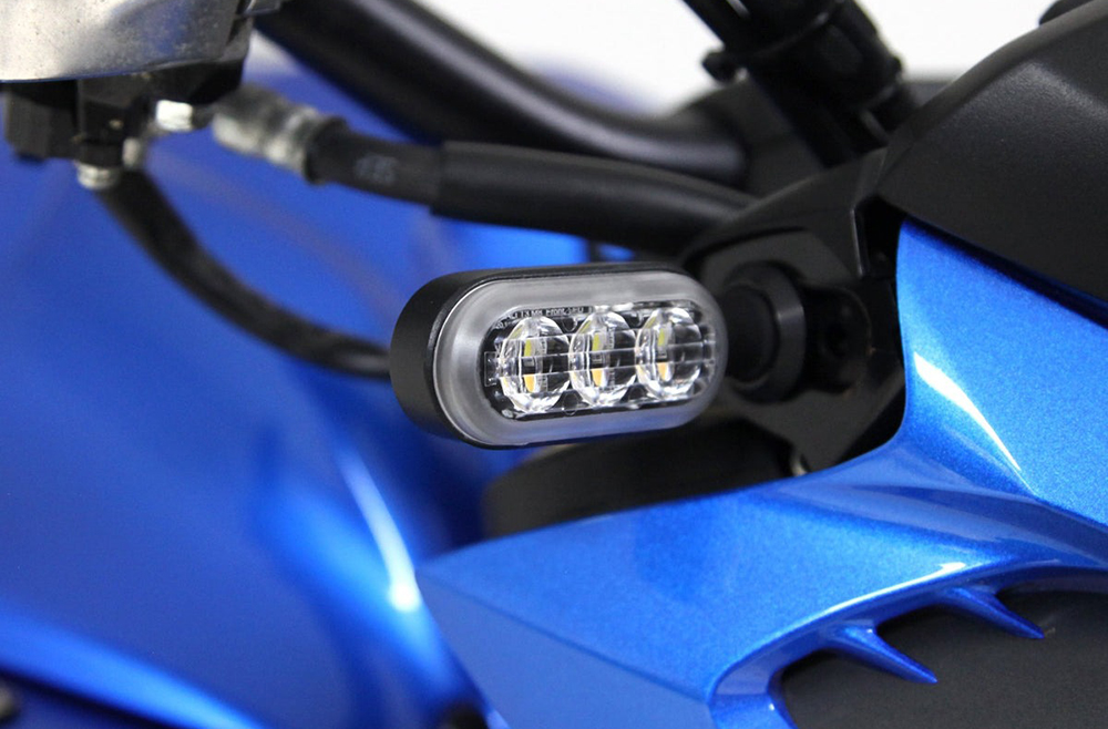 フロントT3ウィンカーは、超高輝度の白色ランニングライトを備え、ウィンカーを作動させるとアンバー色に切り替わります。